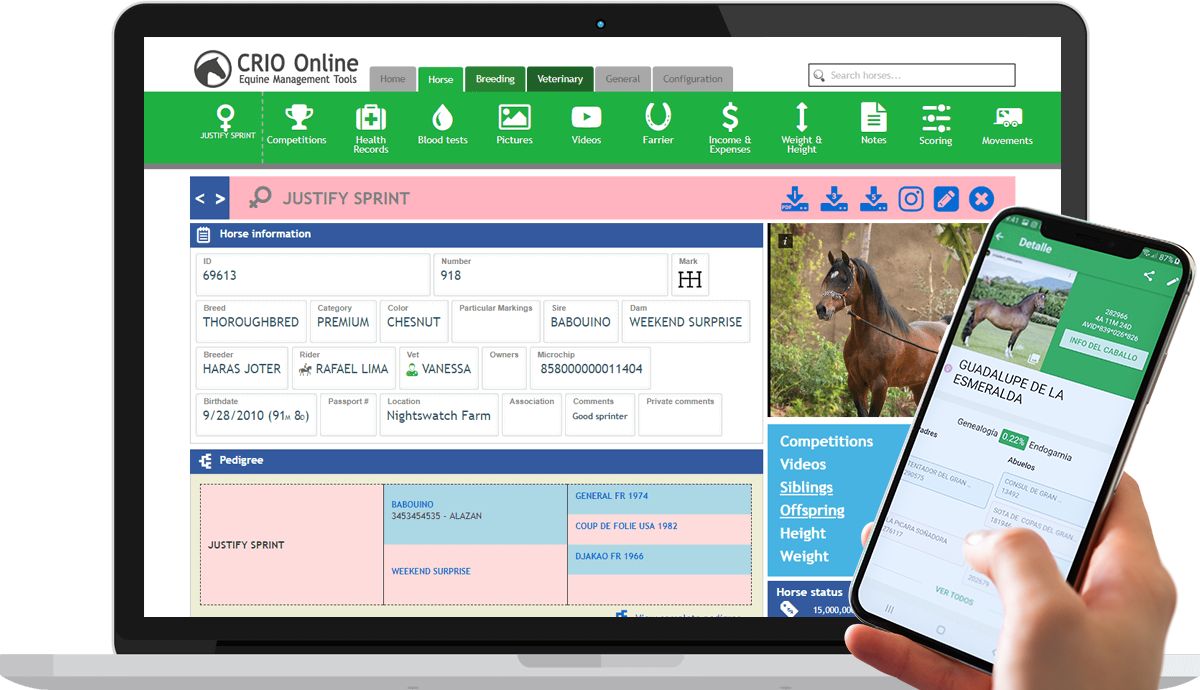 CRIO ONLINE es el sistema de administración equina elegido por los mejores criadores de caballos de todo el mundo, para la gestión de su Haras, Criadero, Cabaña, Centro de Entrenamiento, Centro de Reproducción o cualquier otro tipo de establecimiento equino.